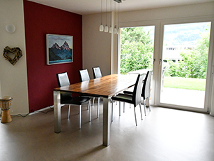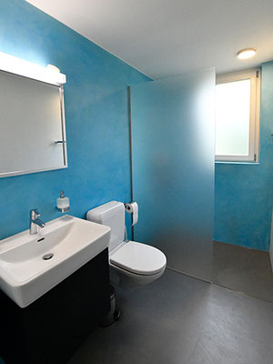 Der Ton-Plattenboden aus den frühen 90er Jahren wurde durch einen fugenlosen Naturofloor-Belag ersetzt. Dieser pflegeleichte Belag besteht aus den natürlichen Rohstoffen Quarzsand und Weisszement und wird in mehreren Arbeitsprozessen aufgetragen – jede Oberfläche wird zum Unikat!