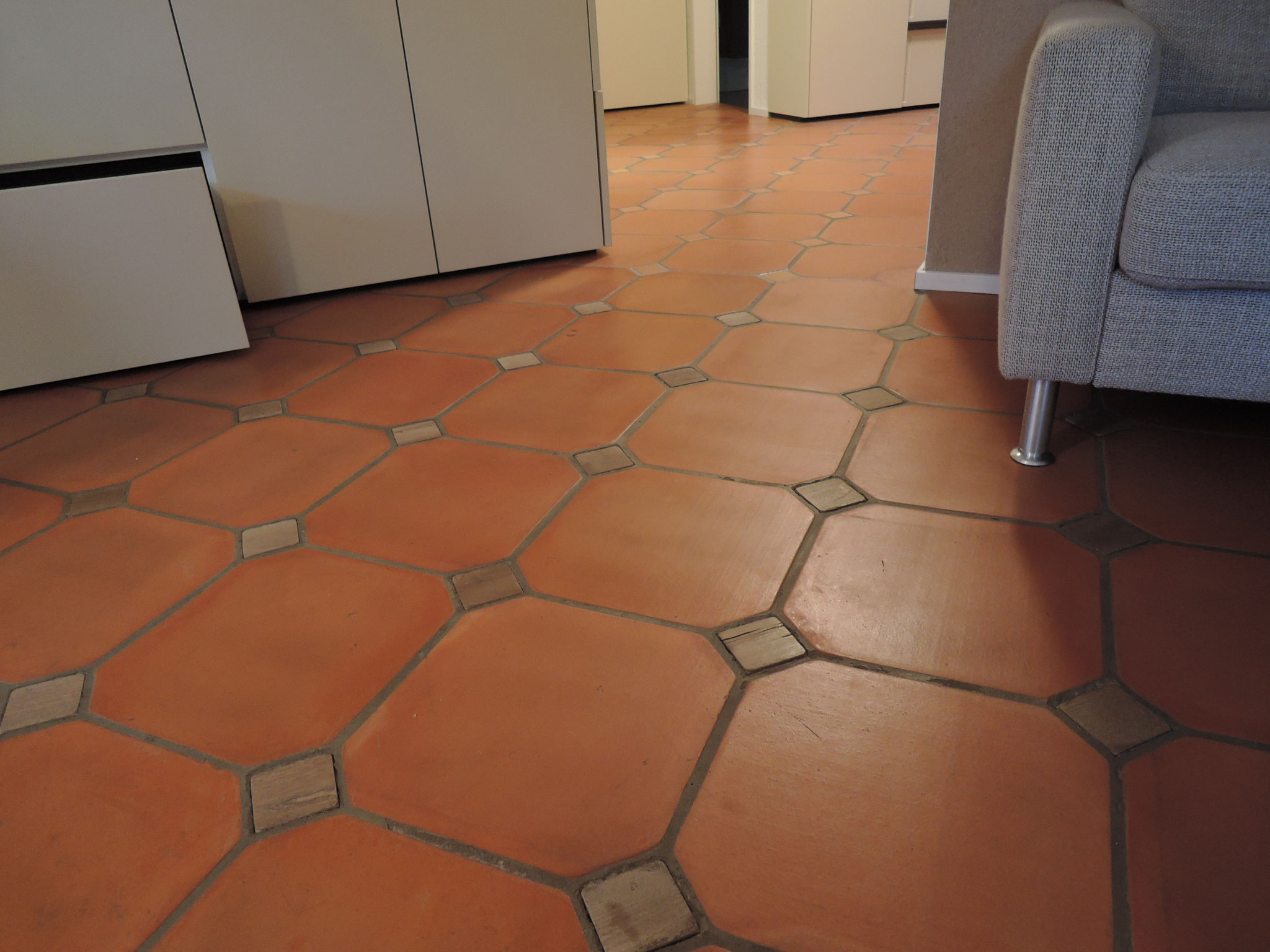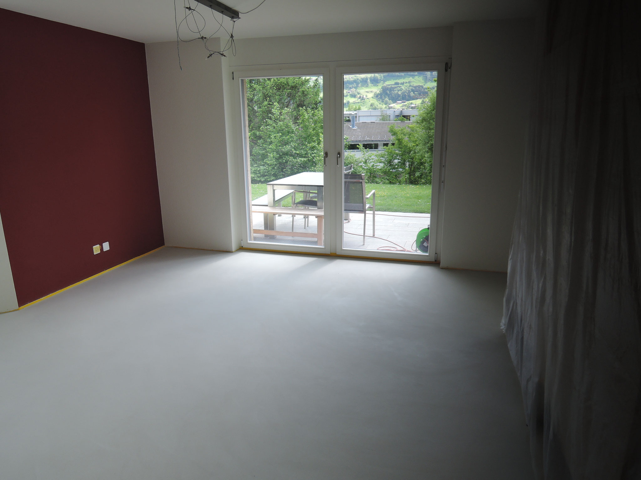 Der Ton-Plattenboden aus den frühen 90er Jahren wird durch einen fugenlosen Naturofloor-Belag ersetzt. Dieser pflegeleichte Belag besteht aus den natürlichen Rohstoffen Quarzsand und Weisszement und wird in mehreren Arbeitsprozessen aufgetragen – jede Oberfläche wird zum Unikat!