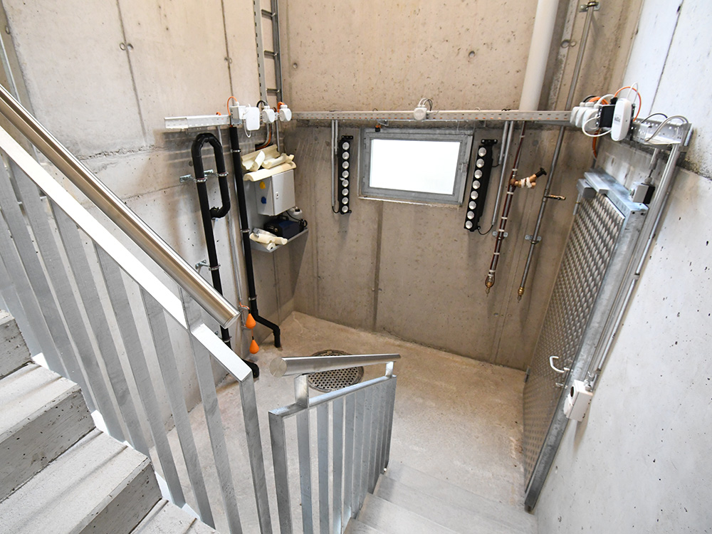 Der bestehende Löschturm wurde dreiseitig durch einen Anbau ergänzt. Im Untergeschoss wurde ein Keller und eine Grube mit einer Verbindung zur bestehenden Überflutungsstation erstellt. Der Anbau wurde fliessend in die bestehende Anlage integriert.