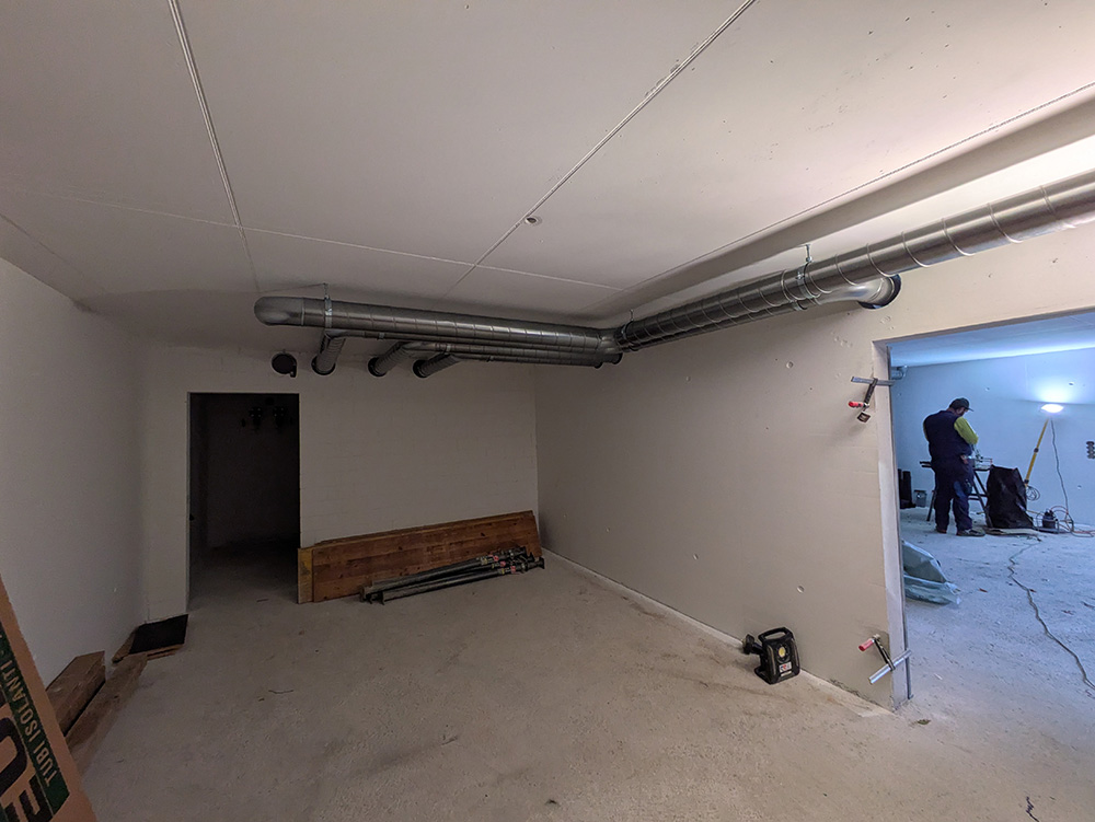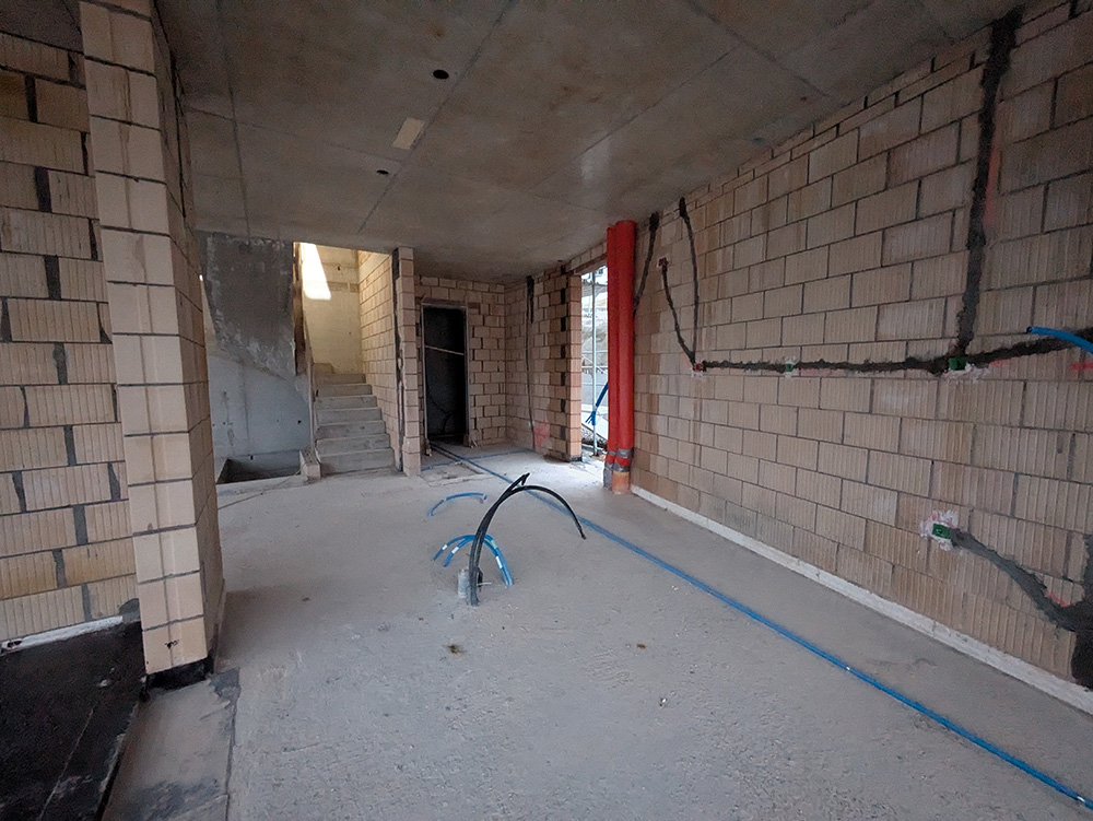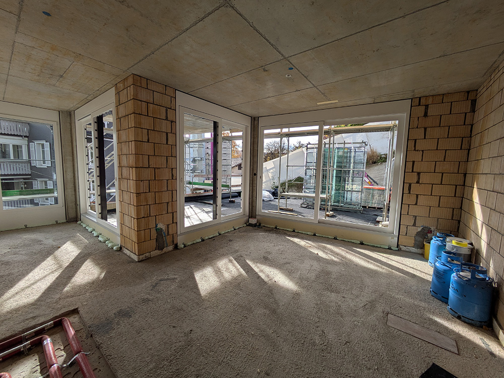 Die Rohmontage von HLSE (Heizung, Lüftung, Sanitär & Elektro) befindet sich auf der Zielgeraden. Zudem wurden die Fenster montiert. Aktuell sind die Abdichtungsarbeiten in Arbeit und danach starten die Gipserarbeiten im Innenbereich und die Fassadendämmung aussen.